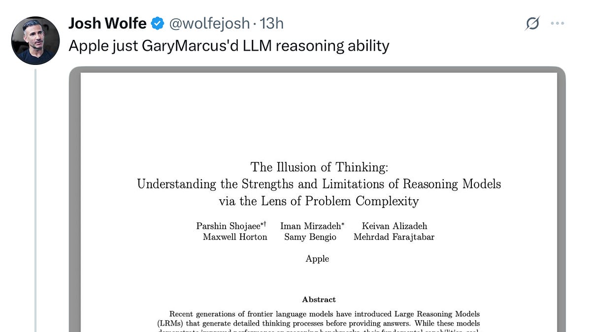 “What the Apple paper shows, most fundamentally, regardless of how you define AGI, is that LLMs are no substitute for good well-specified conventional algorithms.”