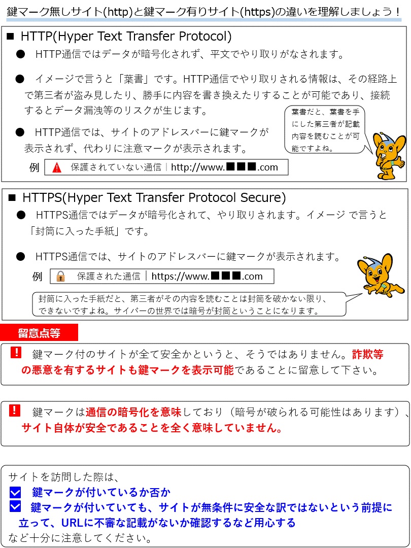 hige 8 months ago X (formerly Twitter)警視庁サイバー攻撃対策センター (@MPD_CCAC) on X【個人向け】 【鍵マーク無しは通信内容が外部に丸見え!鍵マーク有りでも油断禁物!】 #鍵マーク無しのサ... 鍵マークがないので危険