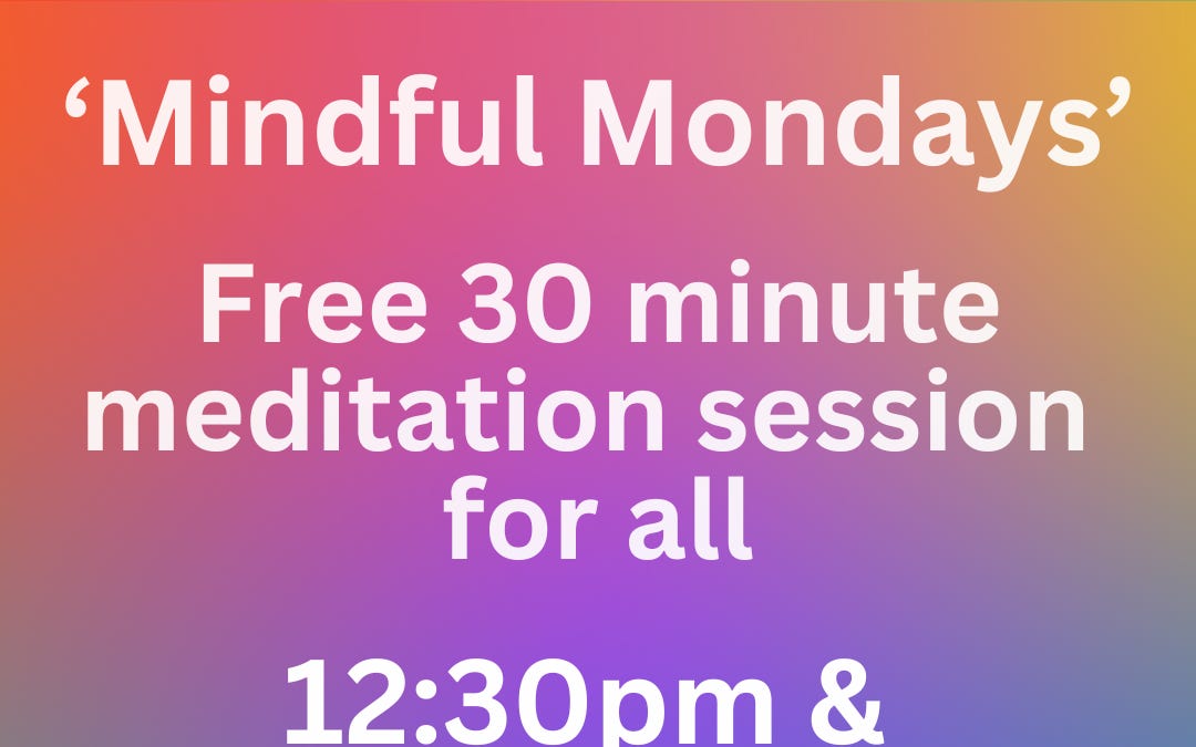 My lovely friend is offering two 30 minute free meditation sessions on Mondays at 12:30 and 7:30pm.