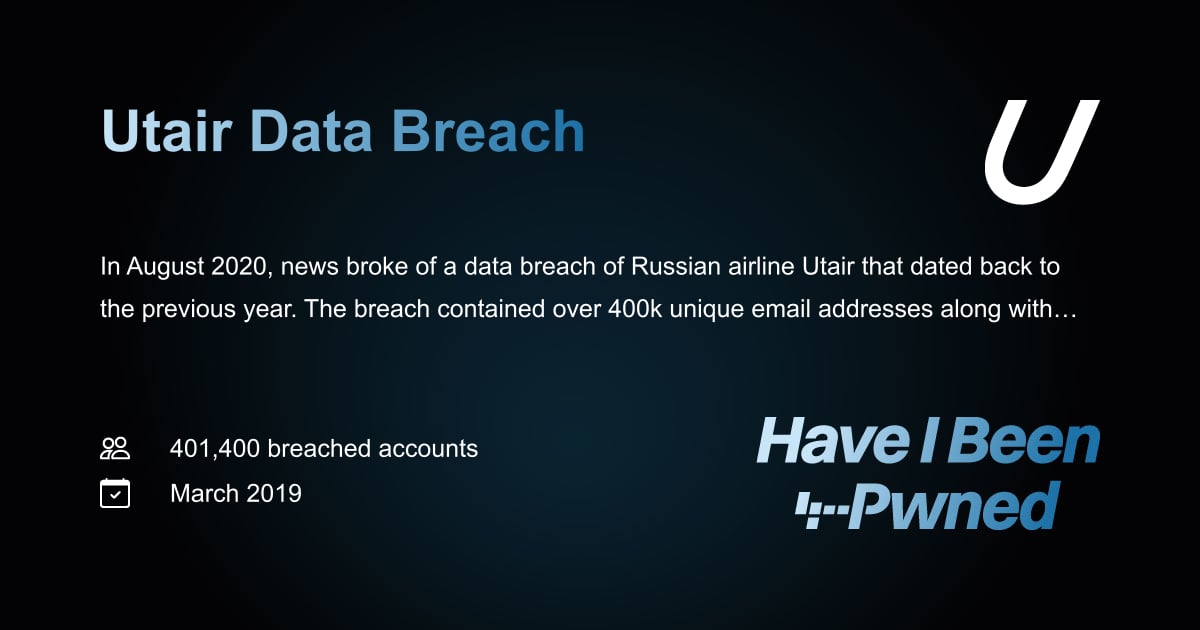 New breach: Russian airline Utair had 400k customer email addresses breached in 2019 and discovered the following year. Data also included name, physical address, DoB and passport number. 79% were already in @Have I Been Pwned. Read more: