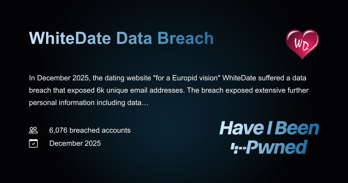 New sensitive breach: Europid dating service WhiteDate had 6k unique emails breached last month, among extensive other personal data including physical attributes and IQ level. 59% were already in @Have I Been Pwned. Read more: