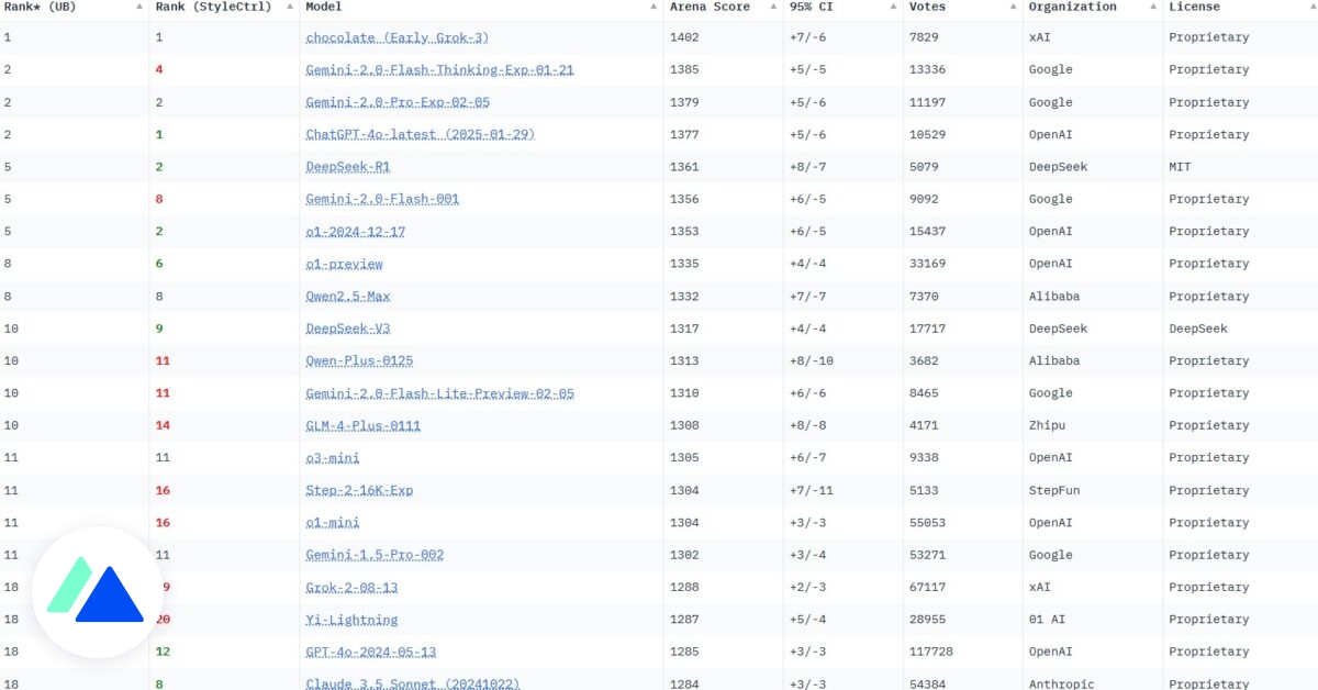 Renaud Lifchitz 11 months ago IA : le top 10 des modèles les plus performants en février 2025 BDMIA : le top 10 des modèles les plus performants en février 2025Ce mois-ci, Grok crée la surprise et se positionne en tête de la Chatbot Arena. Découvrez le classement complet. #nostrfr