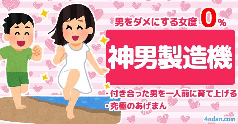 しおは男をダメにする女度0%【神男製造機】付き合った男を一人前に育て上げる究極のあげまん。お互いに成長し合える関係を築けるタイプ。