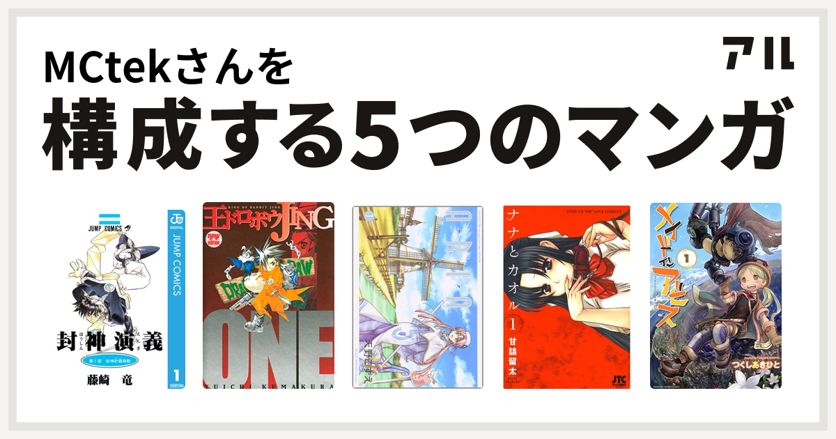 Mayatia/MCtek 2 weeks ago MCtekさんを構成する5つのマンガは 封神演義 王ドロボウJING ARIA ナナとカオル メイドインアビス でした! #私を構成する5つのマンガ より アル | マンガの新刊・無料情報メディアMCtekさんを構成するマンガは封神演義 王ドロボウJING ARIA ナナとカオル メイドインアビス - 私を構成する5つのマンガ | アルMCtekさんを構成するマンガは封神演義 王ドロボウJING ARIA ナナとカオル メイドインアビス!