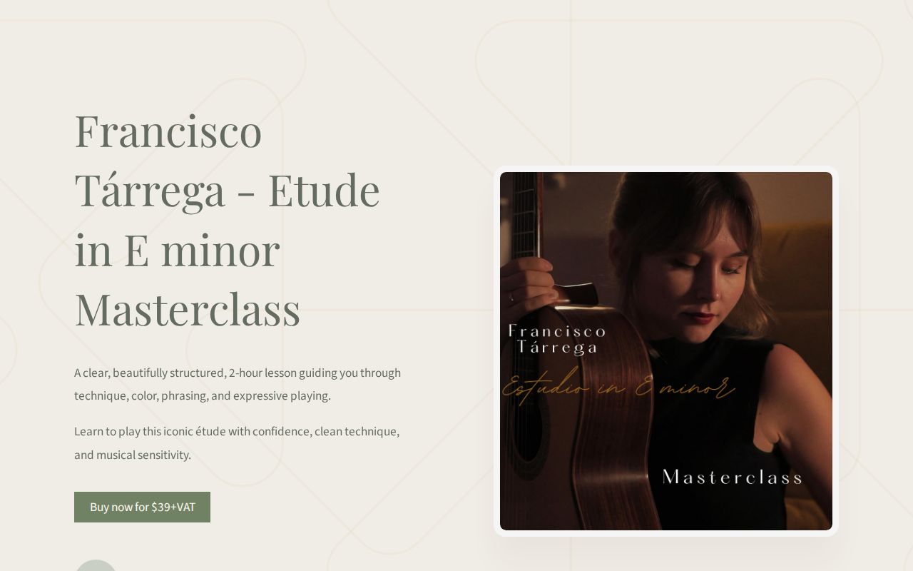 Francisco Tarrega - Etude in E minor Masterclass OUT NOW!🔥 This masterclass shows you how to play this etude, so it feels comfortable in the hands and sounds natural and musical. We focus on: ✔️ Right-hand control and arpeggios ✔️Relaxed barres and smooth chord changes ✔️ Stable rhythm ✔️ Musical details: tone, legato, vibrato, phrasing & dynamics Play along in 4 tempos with metronome. - Close-ups of both hands. 🎥 - High-quality video you can watch anytime. 👩‍🏫 PRICE: 🔥 29 USD + VAT for the first 3 days Then 39 USD. 📧 Link in Bio & Highlights Get your copy here: #classicalguitarist #guitarinstructor guitarlessons Source: