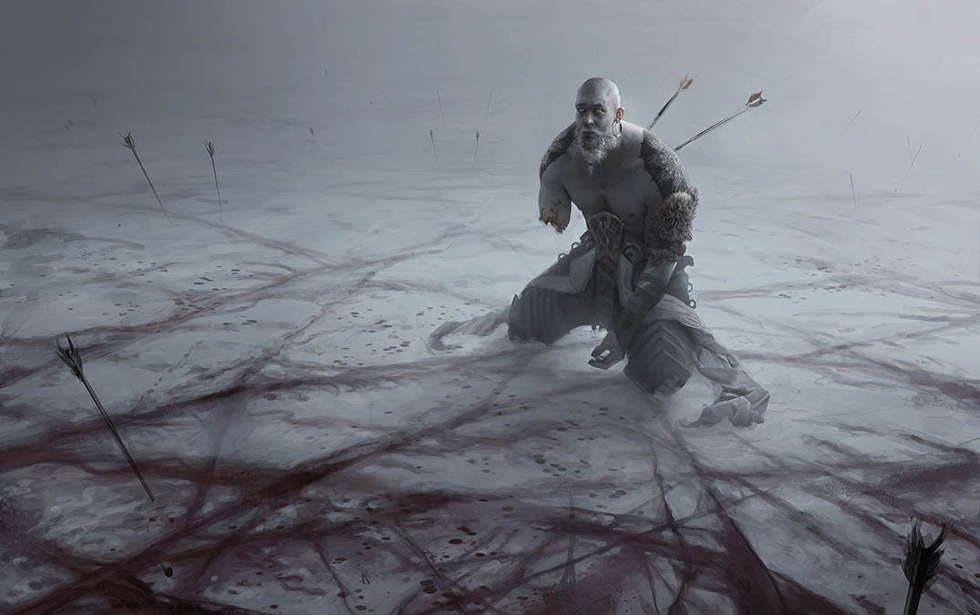 An epic play of warriors dance and clash in the snowy forest, their only audience are the trees and the ones resting in their own pools of blood.