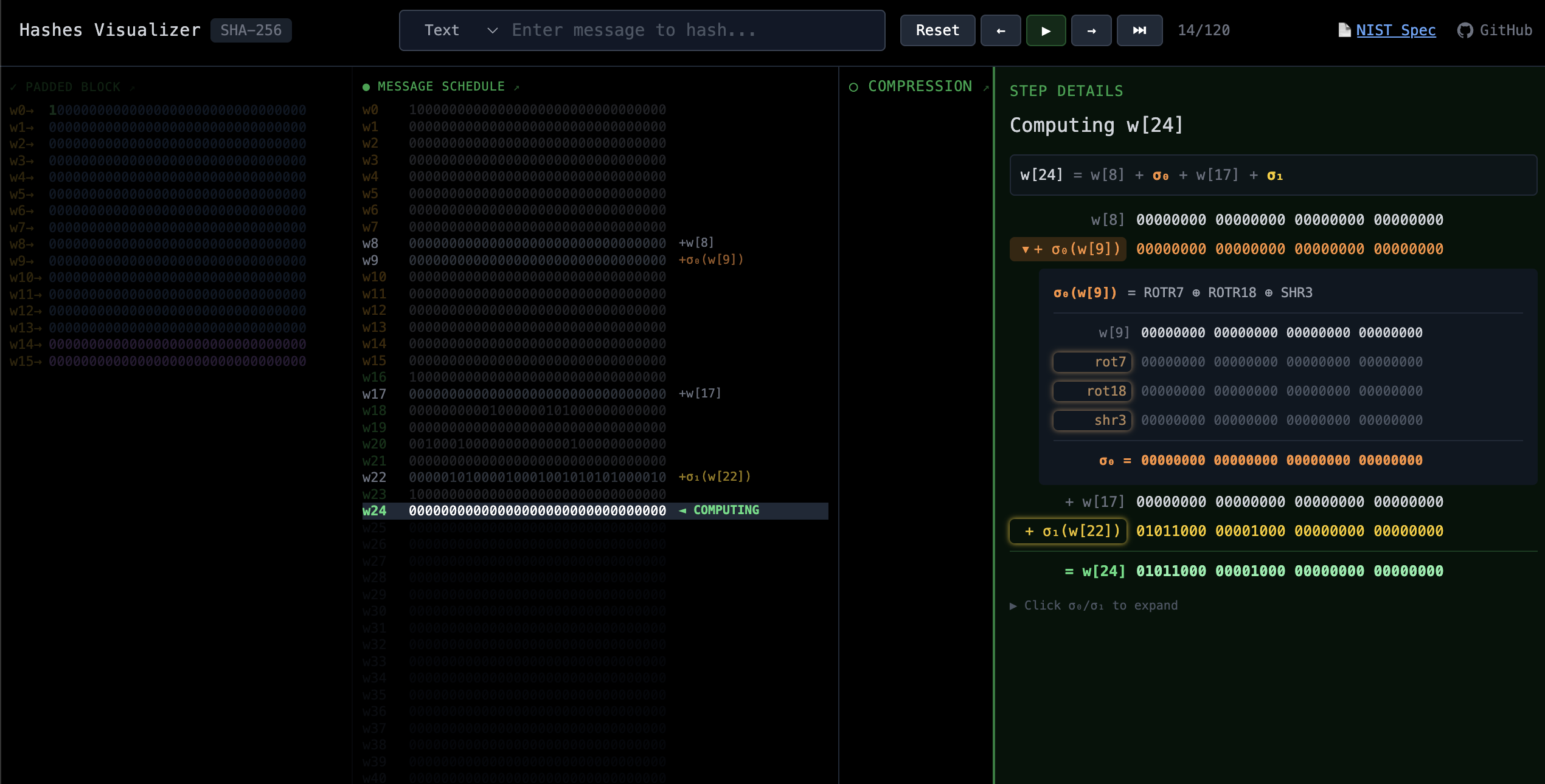 SHA-256 algorithm explained with an interactive, step-by-step visualizer.