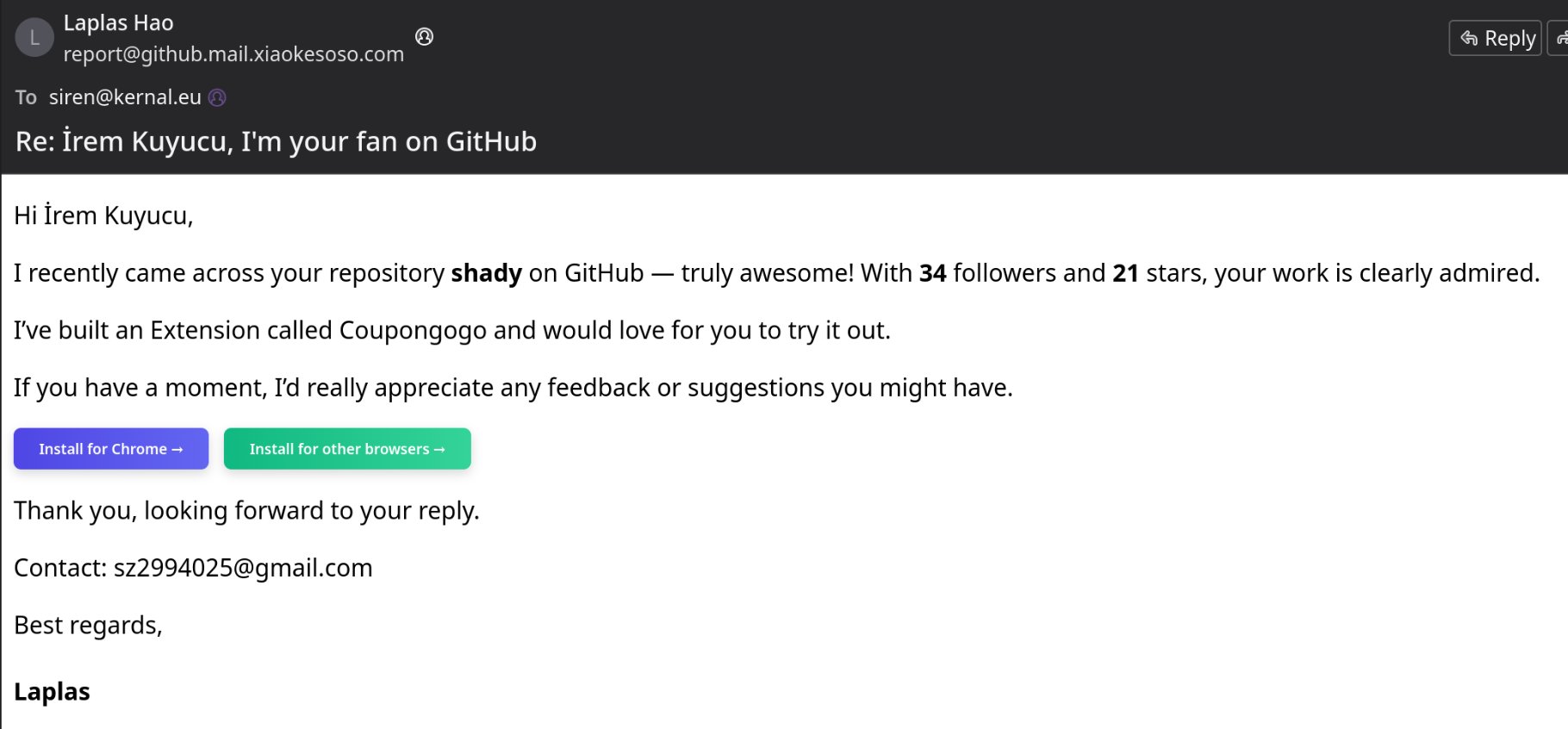 αυγοτάραχο σολωμου 2 months ago coupongogoってなんやと思ったらcrypto-stealerで草 X (formerly Twitter)RasterSec (@RasterSec_com) on X🚨 Our cofounder İrem just caught a crypto-stealer disguised as a coupon extension. Attacker emailed praising her ransomware repo, asked her to...