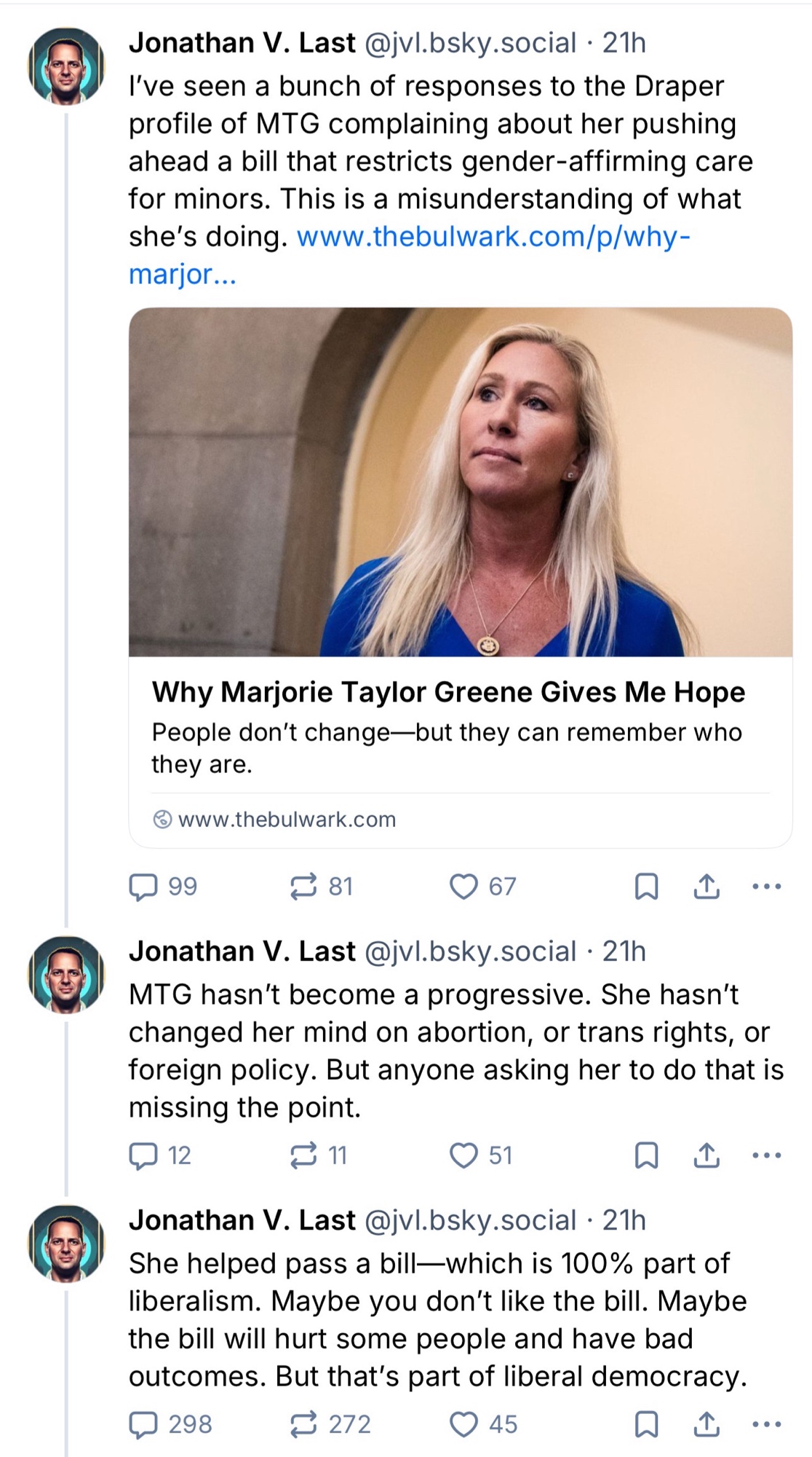 This is why I don’t trust the "Never Trump" Bulwark guys. They’re perfectly comfortable with real people being harmed, so long as the harm comes via a process they can label “liberal democracy.”