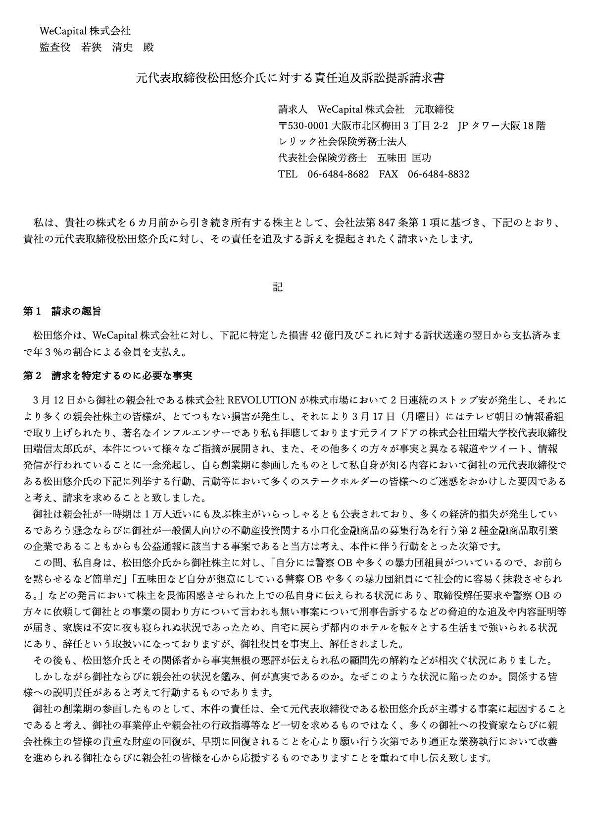 柴山粗大ゴミ捨てました人 10 months ago 革命起こしまくりやな X (formerly Twitter)五味田 匡功|レリック社労士法人代表 (@masa_gomita) on X昨日、株式会社REVOLUTION(東証8894)の子会社であるWeCapital株式会社対して株主代表訴訟提訴請求を行いました...