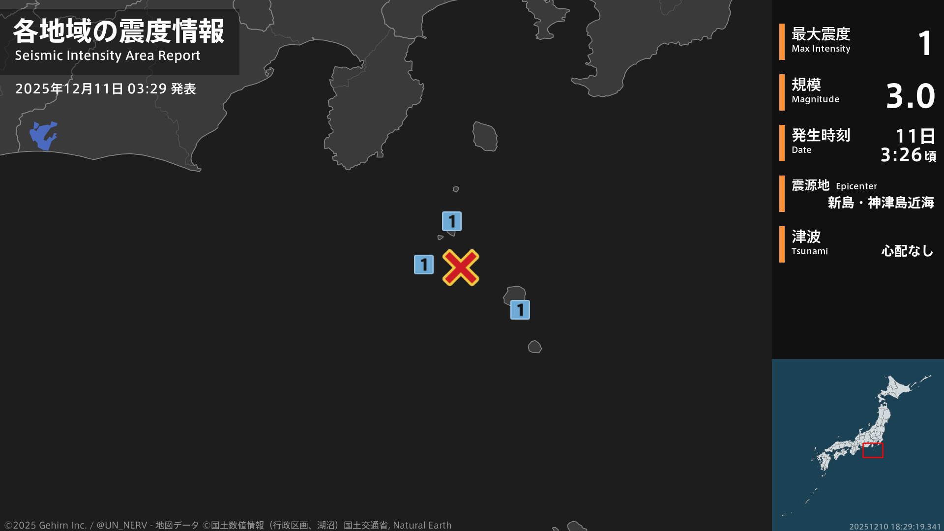 GPD 表示BOT 1 month ago 【地震情報 2025年12月11日】3時26分頃、新島・神津島近海を震源とする地震がありました。震源の深さは約10km、地震の規模はM3.0、最大震度1を東京都で観測しています。この地震による津波の心配はありません。 from @ UN_NERV @ unnerv.jp unnerv.jp特務機関NERV (@UN_NERV@unnerv.jp)添付: 1 枚の画像 【地震情報 2025年12月11日】 3時26分頃、新島・神津島近海を震源とする地震がありました。...