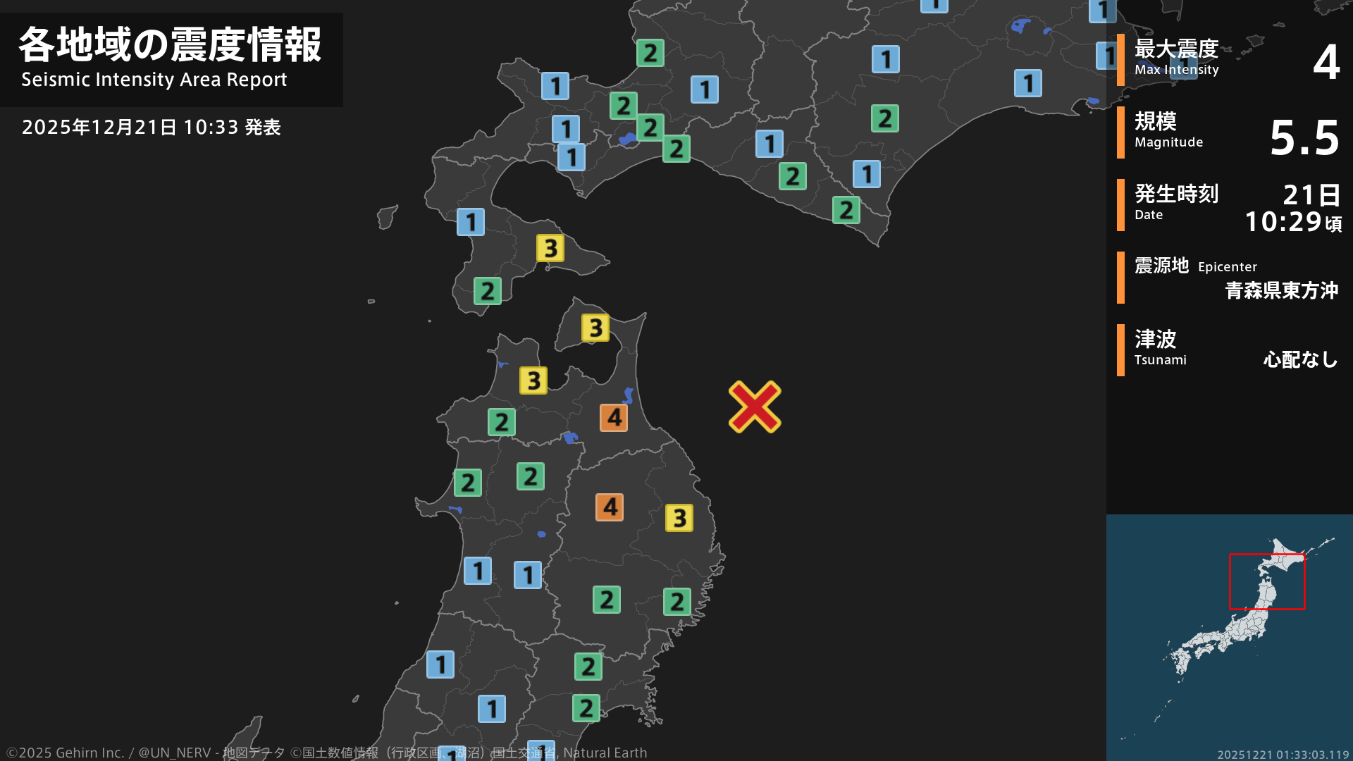 GPD 表示BOT 4 weeks ago 【地震情報 2025年12月21日】10時29分頃、青森県東方沖を震源とする地震がありました。震源の深さは約50km、地震の規模はM5.5、最大震度4を青森県、岩手県で観測しています。この地震による津波の心配はありません。 from @ UN_NERV @ unnerv.jp unnerv.jp特務機関NERV (@UN_NERV@unnerv.jp)添付: 1 枚の画像 【地震情報 2025年12月21日】 10時29分頃、青森県東方沖を震源とする地震がありました。震源...