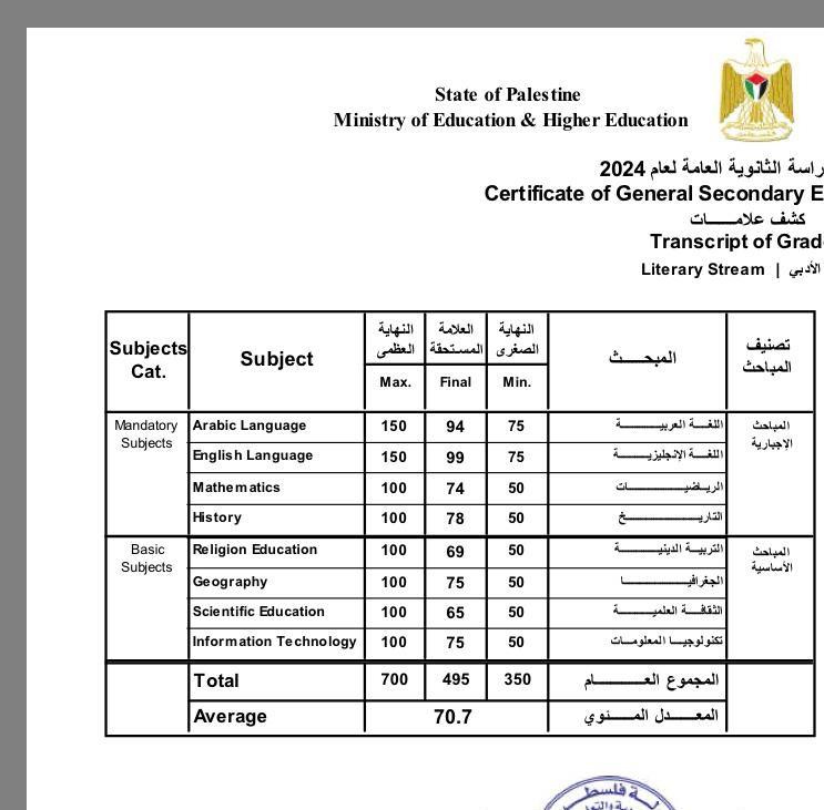 Comme chaque jour je partage la publication de Yazan. Hier il a eu les résultats de son examen d'études secondaires, le Tawjihi. Cela faisait plus d'un an et demi qu'il passait son temps à aller chercher de la nourriture, de l'eau et de quoi abriter sa famille quand il a appris l'ouverture des examens. Il a alors travaillé comme un forcené et a réussi malgré les circonstances terribles (par exemple, il évacuait Gaza sous les bombes lors de l'épreuve de géographie).