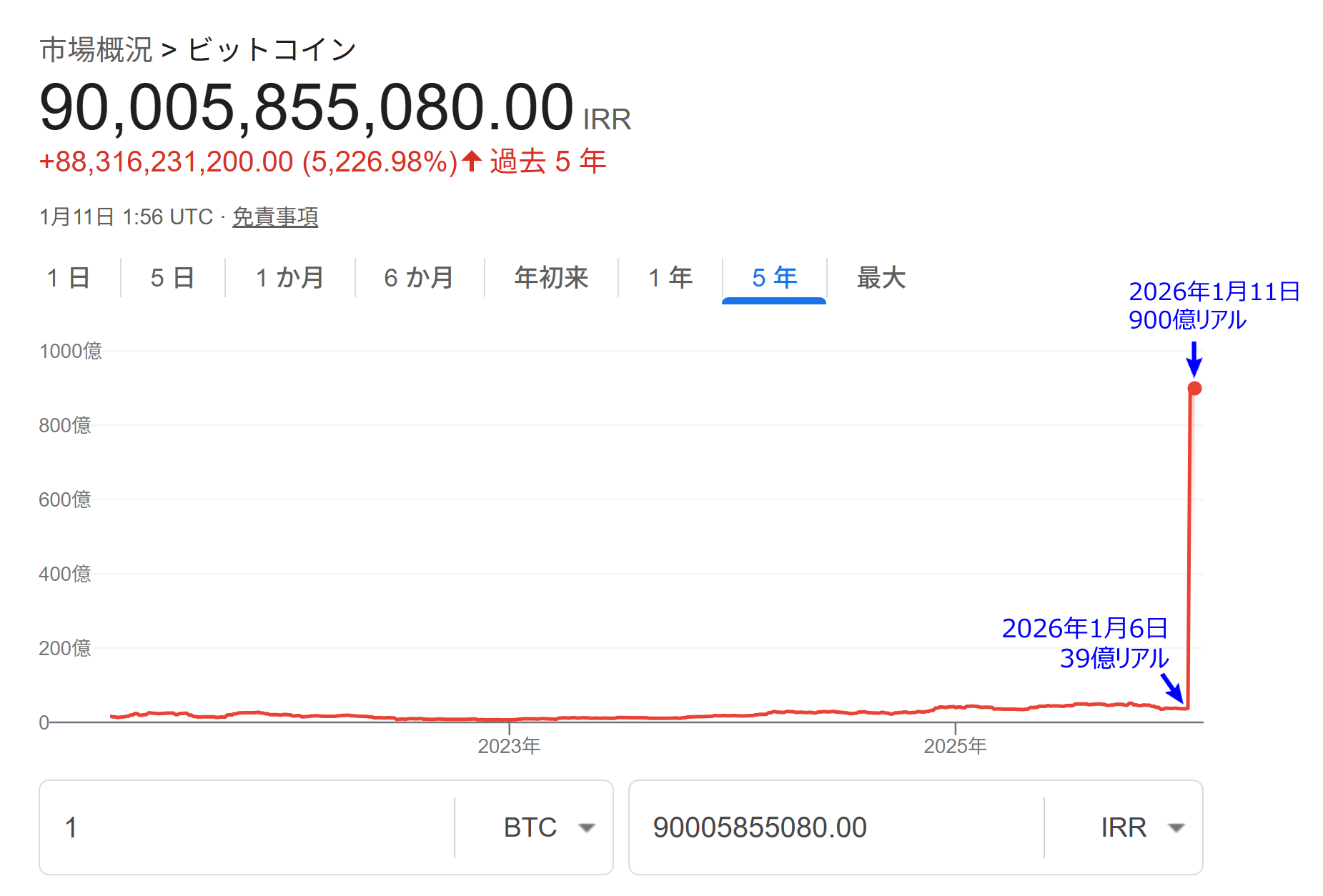 Satoru Nakagawa 3 days ago USD/IRRは1/6に42025。1/7に993585で23.6倍。IRRが投げ売られただけでビットコインは関係ないのでは? X (formerly Twitter)アンゴロウ@暗号資産 (@angorou7) on Xイランでビットコインが史上最高値を更新しています 法定通貨リアルが暴落し、 リアル建てビットコインが...