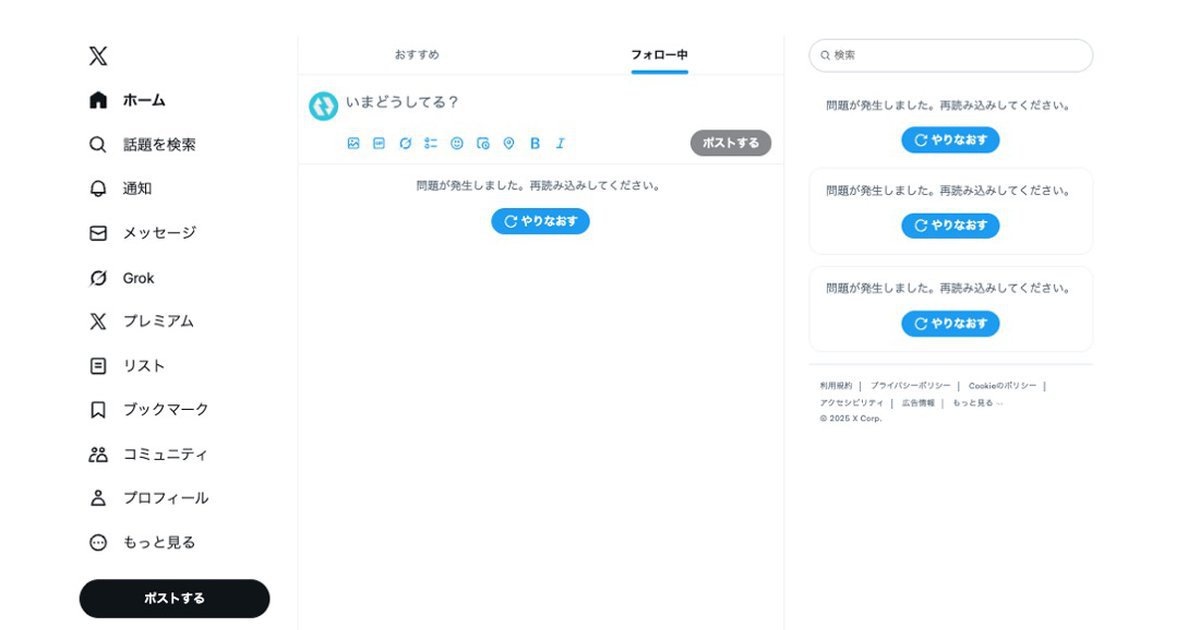 aqz/tamaina :futatsume: yesterday Xでシステム障害 ポストの投稿や読み込みなどできない状態に Xでシステム障害 ポストの投稿や読み込みなどできない状態に #NewsDigest