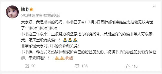 npub18scu...ec8t 1 year ago 今日,有消息称女作家“瞎书”因病去世,年仅29岁。 下午,妈妈在微博发文称她已于今年1月5日因肺部感染经全力抢救无效离世了。“书书这三年以来一直很努力很坚强地与病魔战斗,后期全身的疼痛非常人可以承受,愿天堂没有病痛!” X (formerly Twitter)背包健客 (@bbjk666) on X今日,有消息称女作家“瞎书”因病去世,年仅29岁。 下午,妈妈在微博发文称她已于今年1月5日因肺部感染经...