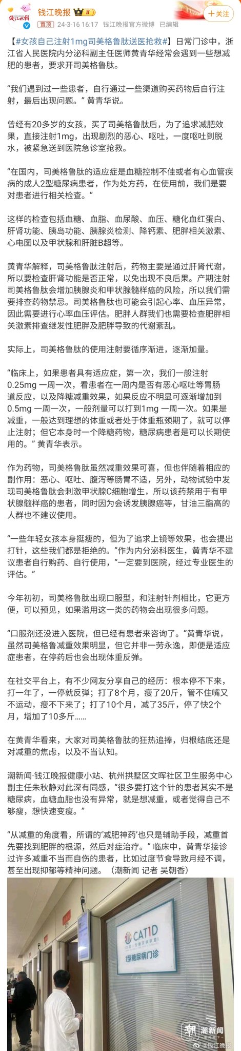 日常门诊ä¸ï¼Œæµ™æ±Ÿçœäººæ°‘医院内分泌科副主任医师黄é’åŽç»å¸¸ä¼šé‡åˆ°ä¸€äº›æƒ³å‡è‚¥çš„æ‚£è€…ï¼Œè¦æ±‚å¼€å¸ç¾Žæ ¼é²è‚½ã€‚