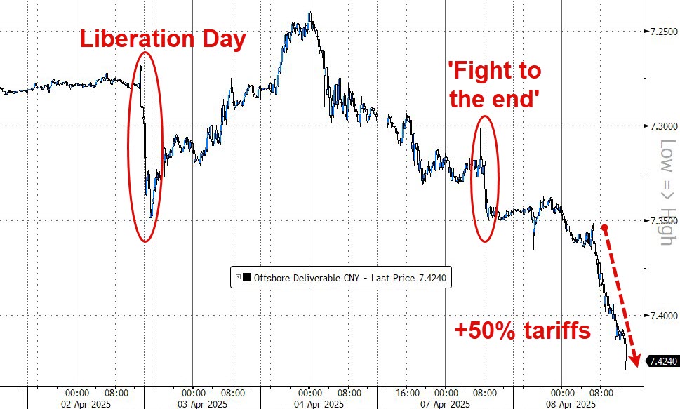 Could Trump Cut China Out Of The Dollar System Could Trump Cut China Out Of The Dollar System By Benjamin Picton, senior strategist at Rabobank To whom much is given... US stocks were a rollercoaster yesterday. Having closed at 5062 on Monday evening, the S&P500 opened Tuesday trade 130 points higher and spent the next 45 minutes rallying up to the 5267 daily high as markets reacted enthusiastically to comments from Trump and Bessent suggesting that there might be room for some countries to cut deals for lower tariffs. Stocks were then sold steadily for the remainder of the trading day as markets reacted to President Trump’s promise to hit China with an extra 50% tariff (104% total) from midnight. The additional tariffs comes in retaliation to the retaliation for the reciprocal tariffs that were apparently imposed in retaliation for long-term cheating on trade. The absurdity of this sequence should make it abundantly clear that the world’s two largest economies are engaged in a tit-for-tat that could conceivably halt bilateral trade altogether. Neither side appears ready to blink; Chinese officials had earlier said that they were prepared to “fight to the end”. Australian economist Warwick McKibbin (a former RBA Board member) recently commented that “the whole world is not having a trade war here. It’s just 20 per cent of the world (the USA) attacking the other 80 per cent.” That characterisation might be (somewhat) true for now, but the situation is likely to metastasize as Europe and others beef up anti-dumping measures on Chinese goods to protect their own industry. The trade war will really go global if the United States tells other countries that the price for providing global public goods like the US security umbrella and the US Dollar as the global reserve asset is a common tariff against China. That would effectively cut China out of the Dollar system, and make it exceedingly difficult for China to raise Dollars to pay for its food and energy imports. China is taking policy measures of its own. CNH weakened to 7.43 yesterday – the highest reading since the establishment of the offshore market in 2009 – and the PBOC fixed the onshore Yuan at its weakest level since September 2023. If the onshore Yuan fixes above 7.2258 in coming days it will be the weakest since before the crisis of 2008. Chinese authorities are clearly allowing the currency to depreciate to offset some of the pain inflicted by US tariffs. This will only further inflame tensions with the White House, given that currency manipulation is one of the US’s major grievances with countries running large trade surpluses. China-adjacent AUD and NZD are trading close to 5-year lows this morning as the tariff deadline approaches.  The yuan is absolutely disintegrating. Expect 8 handle if tariffs go live at midnight. — zerohedge (@zerohedge) 10-year Treasury yields rose 11bps on Tuesday to close the day at 4.29% and yields are up another 4.5bps in Asian trade to 4.335%. That’s a 48 basis point lift in yields since the lows last Friday. Up until yesterday the rise in yields had occurred in tandem with a rally in the DXY index, suggesting investors were actually repatriating funds into the USA and a great deal of the Treasury selling pressure may have been domestic. That dynamic flipped yesterday as the DXY closed lower and yields continued to soar, which perhaps supports views that China (and/or others) is dumping its Treasury holdings to pressure US yields higher and make like difficult for Trump and Bessent. Brent crude active futures were down 2.16% yesterday and are down a further 2.58% to $61.18/bbl today. It’s a perfect storm for crude prices as tariff-induced recession fears collide with much higher supply from OPEC+ producers. Also lurking in the background is Donald Trump’s ‘Big Beautiful Bill’ which contains provisions to slash red tape for US producers to encourage more supply into the market and lower oil prices further. We’re a little sceptical on the efficacy of those ‘Drill, Baby, Drill!’ measures due to the high production breakevens of US producers, but given that Trump recently signed executive orders to boost domestic coal production under powers granted by the Defence Production Act it would be foolish to argue strongly that a similar thing won’t happen with oil. As the Dollar weakens, Gold appears to have found support around the $2,980/oz level and may be poised for gains down the track as US inflation breakevens lift and the probability of a ‘Mar-a-Lago Accord’ to devalue the US Dollar rises. US officials are saying that more than 70 countries have contacted the White House desperate to make a deal on trade. Could a ‘grand bargain’ on weakening the US Dollar be the only deal offered? That would be very Luke 12:48 for US allies.  Just in case the penny hasn’t yet dropped, there is little distinction between economics and geopolitics in the current environment. The Trump Administration is aggressively deploying trade and financial policy to achieve foreign policy goals in similar fashion to what China has been doing for years. This is economic statecraft, make no mistake. To highlight the new Cold War dynamic at play, Volodymyr Zelenskyy overnight said that Ukrainian forces had captured two Chinese soldiers fighting alongside Russian troops in Eastern Ukraine, and that he had information that “significantly more Chinese citizens” were serving in Russian military units. This follows earlier news that North Korean soldiers have been embedded alongside Russian forces in Kursk. Zelenskyy’s claim has not been independently verified, and it is not yet clear whether the Chinese soldiers were volunteers or fighting at the behest of the Chinese government, but Zelenskyy has directed his Foreign Minister to contact Beijing demanding answers. Wed, 04/09/2025 - 13:05