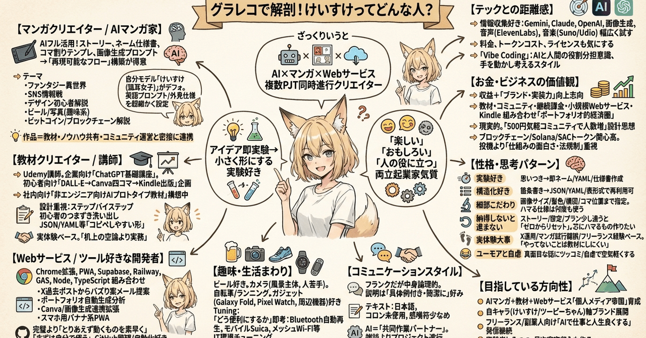 OrzBruford 2 weeks ago 年末なので久しぶりにやってみた。 note(ノート)Nano Banana Proに個人図解を作らせたら面白かった【プロンプト付き】|けいすけこんにちは。けいすけです。 Xで図解っぽいポストをしたらインプレッションが伸びましたので、作り方を公...