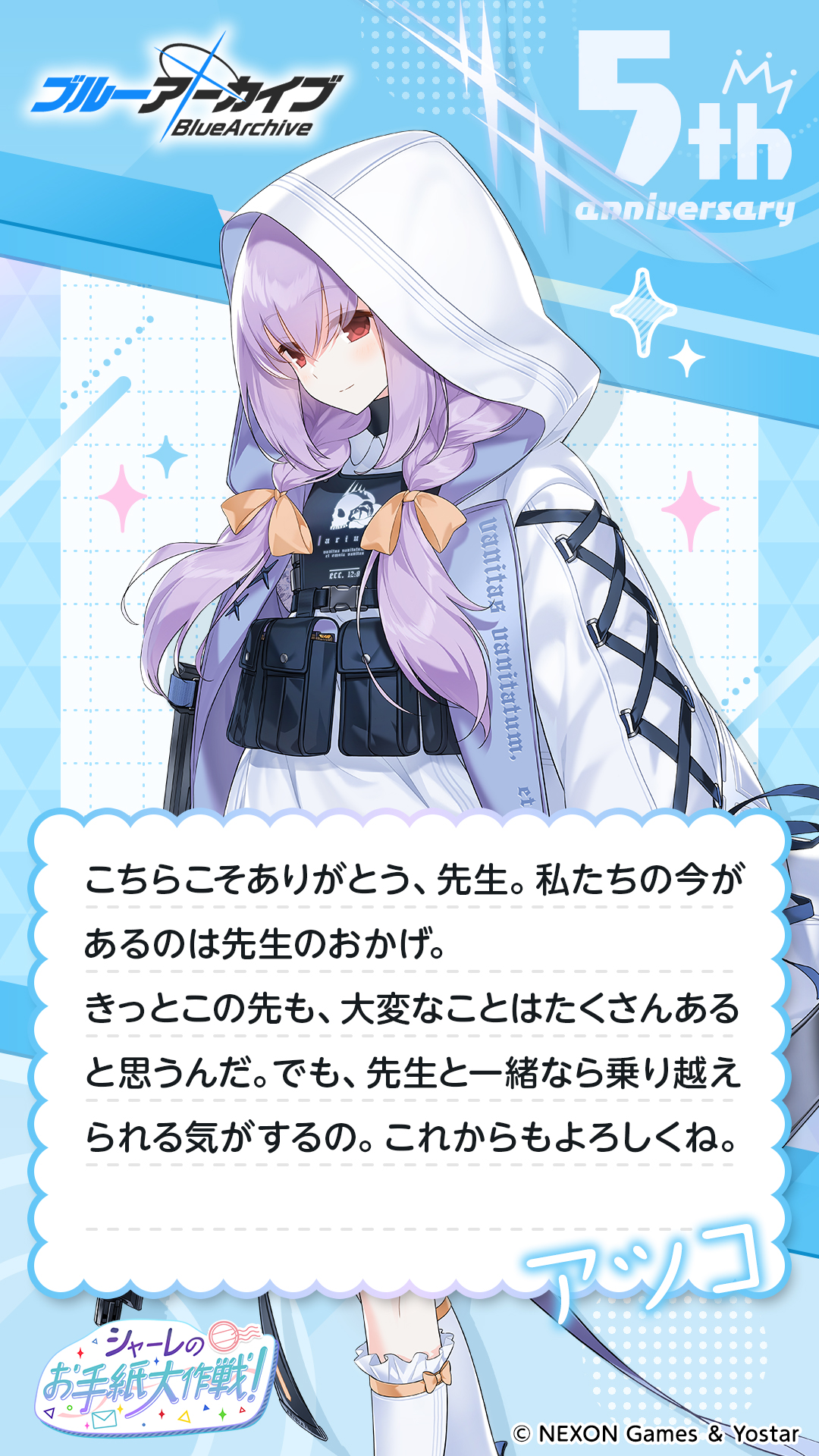 SK 1 week ago X (formerly Twitter)ブルーアーカイブ公式 (@Blue_ArchiveJP) on X@sk_kenzen 先生!アツコさんからお返事が来ました! View quoted note →