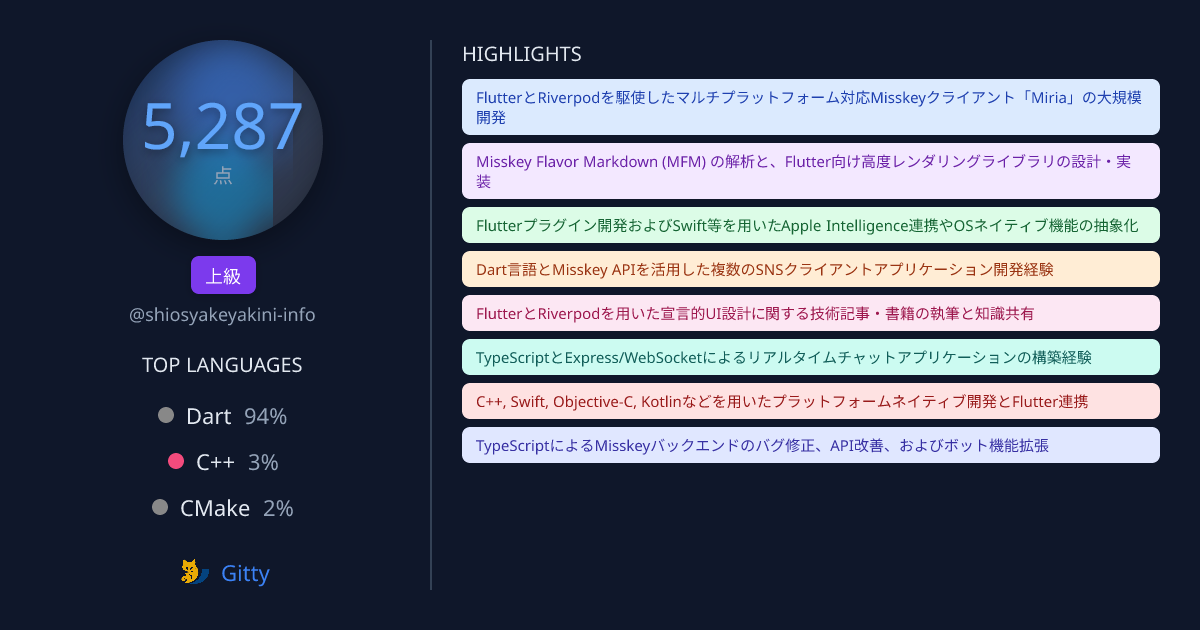 そらいろ 3 days ago ほえー Gittyshiosyakeyakini-info のスキルプロフィール | Gittyshiosyakeyakini-info さんのGittyスコアとエンジニアスキルの詳細プロフィールを表示します。 というかちゃんとgit管理してないものが昔のやつにわりとあるのでそのへんいれたらまた変わりそう