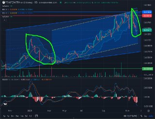 We've bounced at the mid-point of the largest parallel channel. If this pattern repeats (from the earlier fractal pattern) this (right now) is your best chance of a cheap entry, with one more chance, slightly later, perhaps ... 4-5 weeks from now, the latter chance comes, only if the current three leg downside turns into a 5 leg Elliot wave. It may not (likely dependent on the overall market; i.e. BTC/ETH performance).