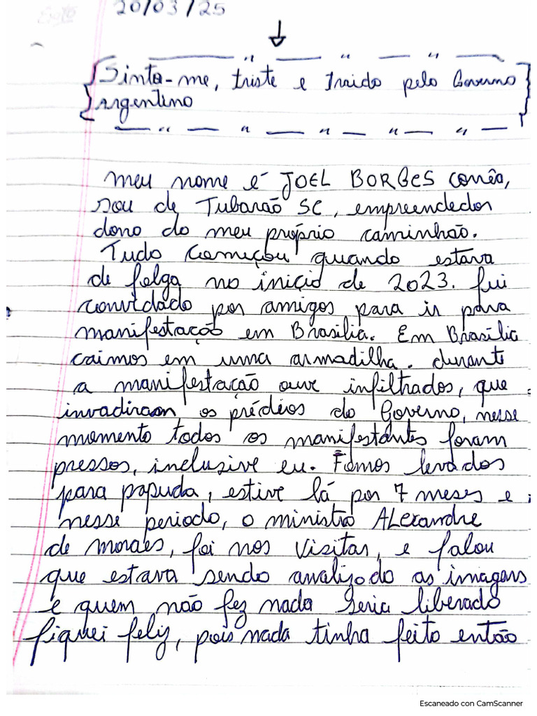 Ainda no documento, Corrêa diz não ter esperanças. "O governo que fala em liberdade nos mantém presos", observou o homem. "Que liberdade é essa? Hoje, estamos presos em quatro homens e uma mulher, aqui, na Argentina. Todos sem antecedentes criminais. Até quando ficaremos aqui?"