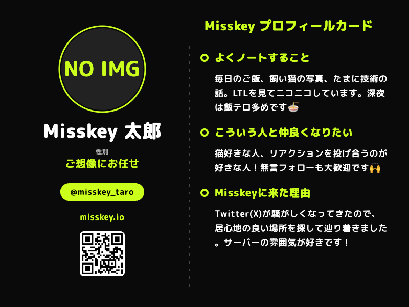 ナギサカ🦝:watasiha_ninngenndeha_arimasenn: 5 days ago アカウント歴だけ見れば:misskey_rouzin_kai:ですが、:role_kigaru_ni_hanasikakete_ne: #misskeyプロフィカードメーカー Misskey プロフィールカードジェネレーターMisskey プロフィールカードジェネレーターMisskey用の自己紹介カードを簡単作成!画像はブラウザ内で処理されるため安心です。
