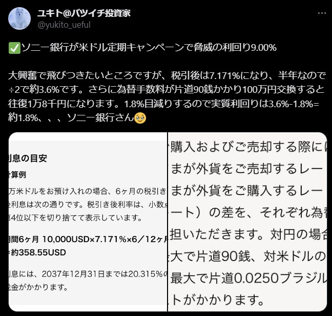fuminbrand@禁足地に渡れぬ男 2 years ago X (formerly Twitter)ユキト@バツイチ投資家 (@yukito_ueful) on X先日のソニー銀行の年利9%の外貨預金(実質3%強)もですが、なぜこのタイミングで銀行がこぞって高利率の外貨...