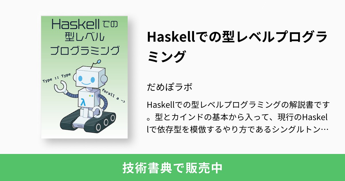 かんずめ 7 months ago 今日は関数型まつり 技術書典オンラインマーケットでだめぽラボの「Haskellでの型レベルプログラミング」を購入しました! #技術書典 技術書典:技術書オンリーイベントHaskellでの型レベルプログラミング:だめぽラボHaskellでの型レベルプログラミングの解説書です。型とカインドの基本から入って、現行のHaskellで依存型を模...