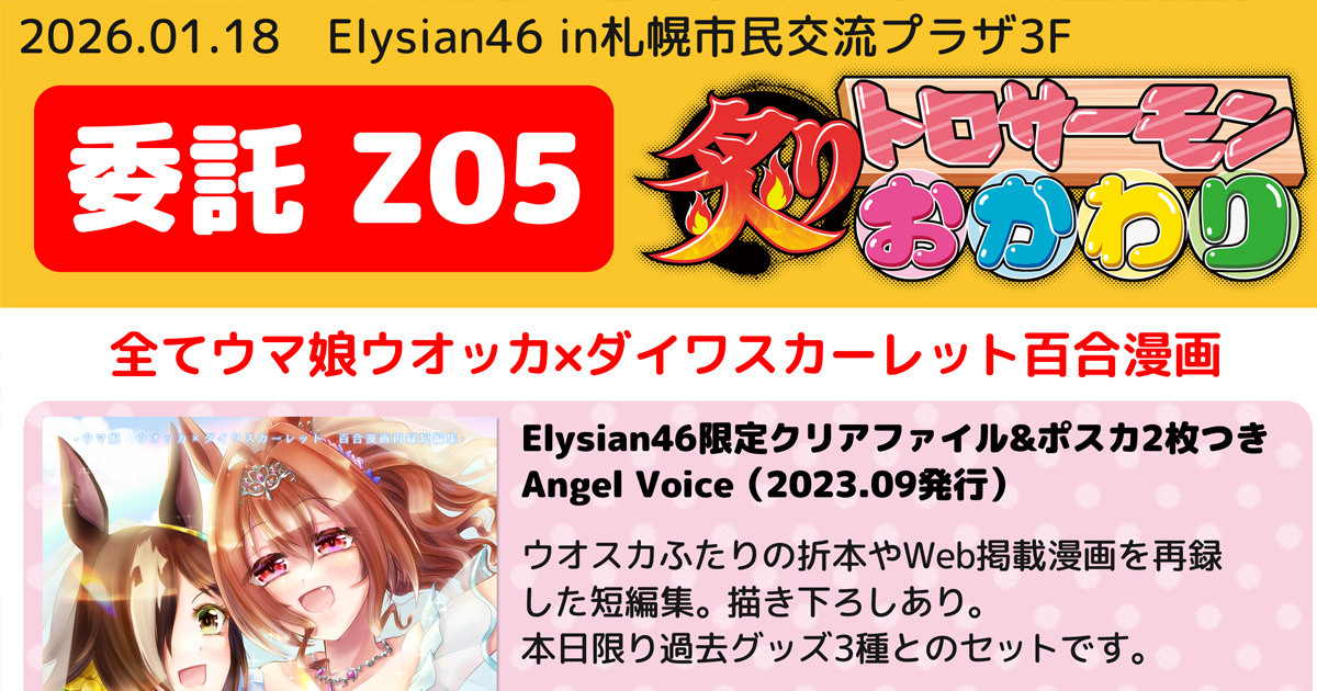 さゆん :skeb::irai_bosyuu_tyuu: 6 days ago 【お品書き】2026年1月18日(日)札幌市民交流プラザ3階クリエイティブスタジオで開催のElysian46に委託参加します。スペースは「Z05」です:blobcatmeltlove: ・お品書きの3種類の本を頒布します。いずれも既刊ウマ:musume:ウオスカ百合漫画。 ・本人不在です。本部近くに委託頒布スペースがありますのでそちらでお求めください。 詳細はFANBOXの全体公開記事へどうぞ! pixivFANBOX【即売会お品書き】2026.01.18(日)Elysian46(札幌市民交流プラザ3F)委託Z05炙りトロサーモンおかわりお品書き|さゆん|pixivFANBOX2026年1月18日(日)札幌市民交流プラザ3階クリエイティブスタジオで開催の、Elysian46に委託参加します。本人... #Elysian46 #さゆんの絵 #お品書き