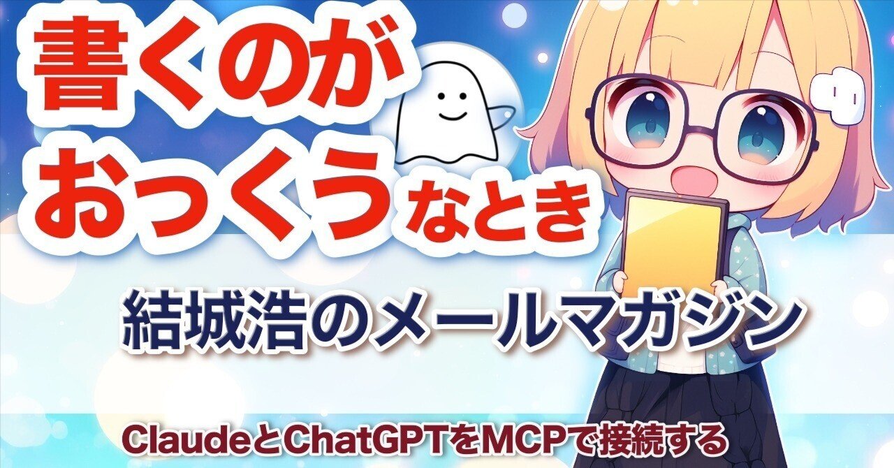 結城浩 / Hiroshi Yuki 3 months ago 私が毎週配信しているメールマガジン、最新号が出ました! ClaudeとChatGPTを接続/40歳を過ぎて「本を執筆したい」という気持ちに/AIとの付き合い方/書くのが億劫なとき|結城浩 / Hiroshi Yuki 結城浩 / Hiroshi YukiClaudeとChatGPTを接続/40歳を過ぎて「本を執筆したい」という気持ちに/AIとの付き合い方/書くのが億劫なとき|結城浩 / Hiroshi Yuki結城浩の「コミュニケーションの心がけ」2025年10月28日 Vol.709 はじめに おはようございます。 「談話室...