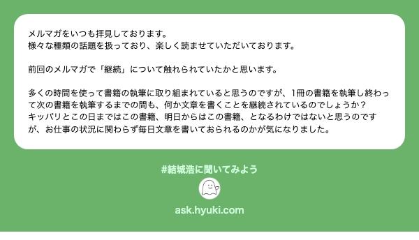 結城浩 / Hiroshi Yuki 3 months ago 質問(執筆の合間) そうですね。何も文章を書かない日というのはおそらくまったくありません。もしも文章を書かない日が仮にあったとしても、次に書く本のことをずっと考えています。 書籍が執筆し終えてから、次の書籍を執筆開始するということもあまりなくて、多少はオーバーラップしているのが普通です。書籍の原稿を編集部に送ってから刊行するまでの間には時間がだいぶありますから、当然次の本の準備を進めていますね。 本の原稿を書かない日はありますが、文章を書かない日はたぶんありません。 #結城浩に聞いてみよう 結城浩に聞いてみよう結城浩に聞いてみよう結城浩に匿名で質問を送るサイトです。