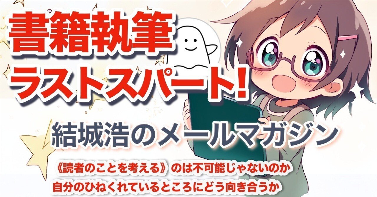 結城浩 / Hiroshi Yuki 2 months ago 配信予約ができました〜!😊 2026年に刊行予定の書籍が脱稿直前! 「書籍執筆のラストスパート」と題して、執筆開始時と脱稿直前では心持ちや行動がまったく違うこと、全体像が見えてきたときの楽しさと注意点についてお話しします! 定期購読なら初月無料! 結城浩 / Hiroshi Yuki結城メルマガ|結城浩 / Hiroshi Yuki数学青春物語『数学ガール』の著者が、AIとの付き合い方、文章の書き方、書籍の執筆、教え方と学び方、仕...