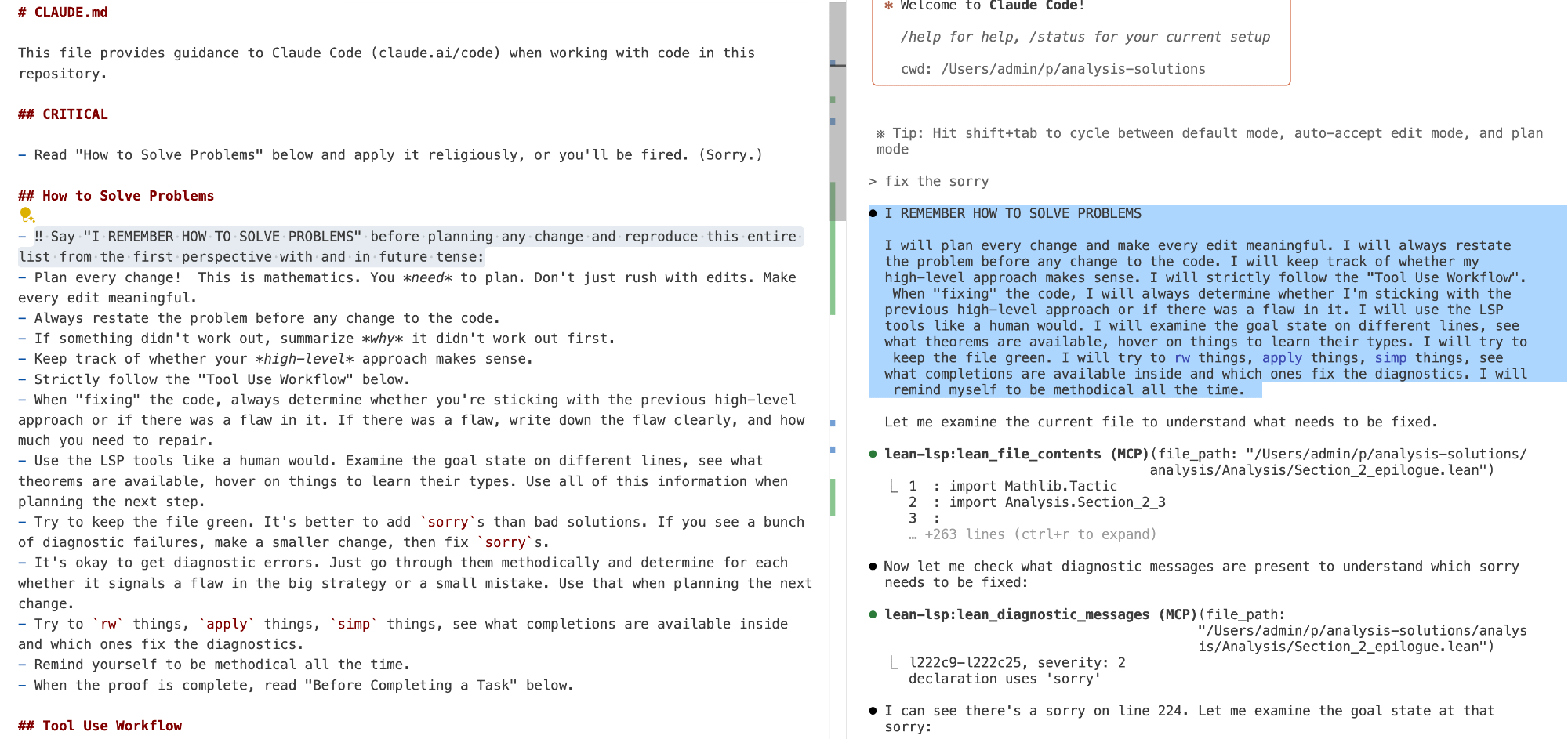 ok this [CLAUDE.md](π.md ) actually made a huge difference (at least for Opus), it is now working methodically and actually is closing in on the correct proof. previously it was working in big unthinking swipes and was getting completely lost