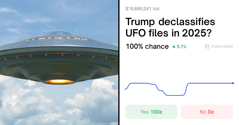 ODELL π‘οΈ 1 month ago PolymarketTrump declassifies UFO files in 2025? Odds & Predictions | PolymarketView real-time odds on "Trump declassifies UFO files in 2025?" as of January 13, 2026, and trade on The World's Largest Prediction Marketβ’